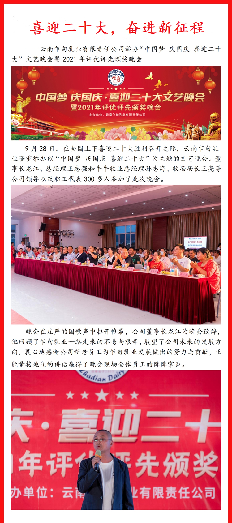 9月28日,在全国上下喜迎二十大胜利召开之际,云南乍甸乳业隆重举办以“中国梦 庆国庆 喜迎二十大”为主题的文艺晚会。董事长龙江、总经理王志强和牛牛牧业总经理孙志海、牧场场长王亮等公司领导以及职工代表300多人参加了此次晚会。